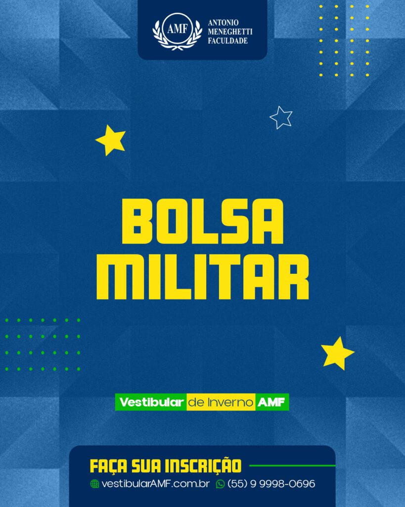 Para você, militar que pretende estudar em algum Curso de Graduação da AMF, criamos o Incentivo para Militar, benefício que garante 35% de desconto no valor das mensalidades até o final do curso! A Bolsa de Estudos é voltada para quem trabalha na Base Aérea Militar, Exército do Brasil, Marinha do Brasil, Brigada Militar/Polícia Militar, Polícia Civil, Corpo de Bombeiros e Polícia Rodoviária; o benefício também é válido para familiares de primeiro grau (pai, mãe ou filhos) do militar. Você só precisa comprovar o vínculo de trabalho ou parentesco e solicitar o desconto no momento de sua matrícula.
