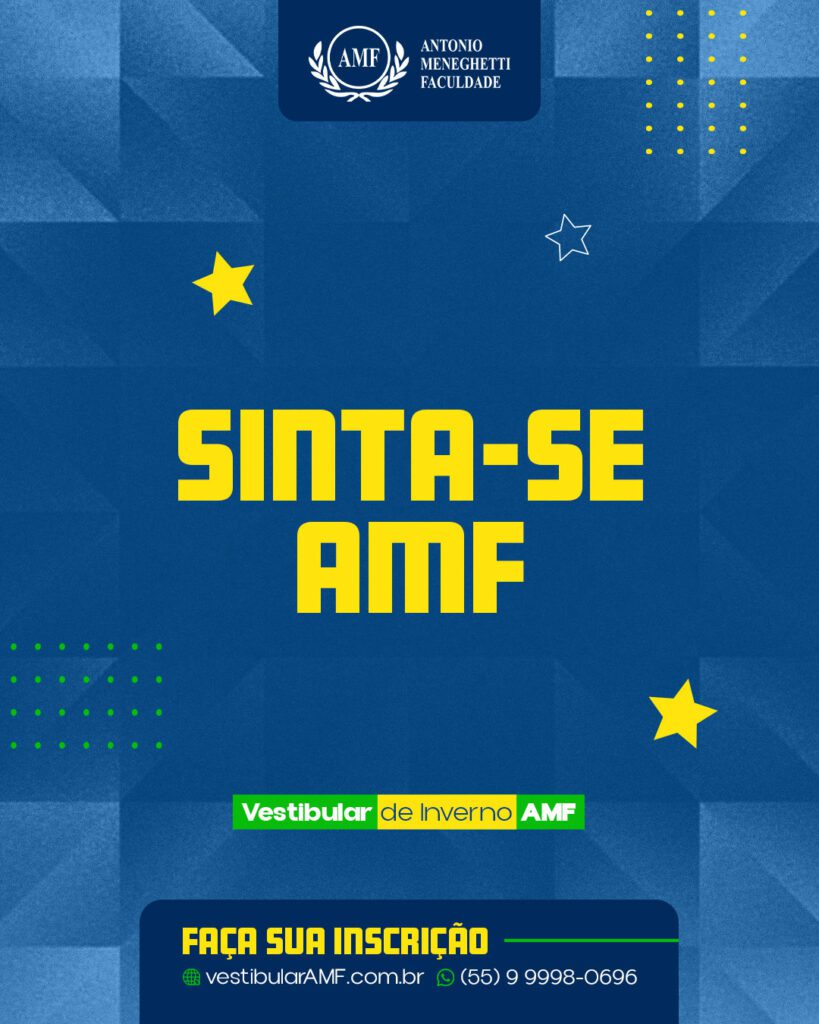A AMF convida você para participar do Sinta-se AMF, um projeto que vem com uma proposta diversa de testes vocacionais e feiras das profissões, apresenta foco na amplitude de formação oferecida na AMF, que abrange os âmbitos pessoal, acadêmico e profissional, resultando na construção de um indivíduo responsável, capaz de, com a sua atuação, beneficiar o contexto onde está inserido, pois queremos contribuir com esse importante momento. Durante o Sinta-se AMF, além da apresentação da faculdade, cursos e do Campus Recanto Maestro, faremos o “Passando a Limpo de Jovem para Jovem”, um momento de sensibilização e reflexão individual, no qual alunos AMF contam as suas próprias experiências, em uma conversa descontraída que busca discutir tantas questões pelas quais passamos durante uma das fases mais belas e importantes da vida! Venha participar conosco!